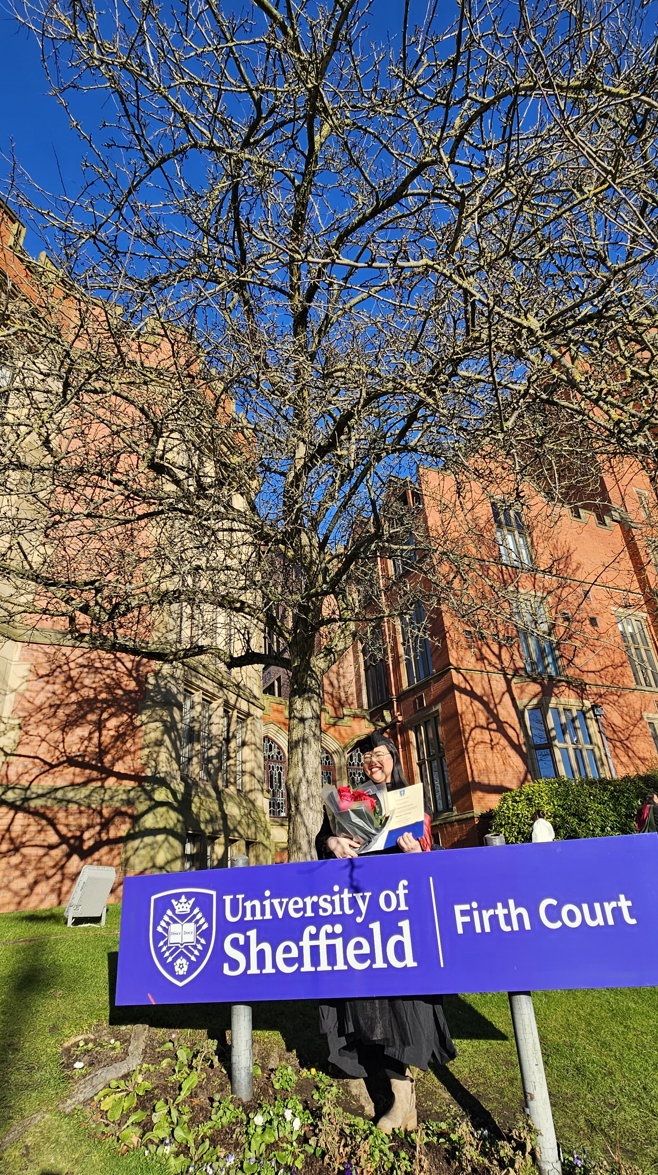 Và rồi ở tuổi 37, khi đã tích lũy đủ tài chính sau bao năm cố gắng, cũng như nhận được sự đồng hành và chia sẻ chí hướng từ chồng con, mình và gia đình nhỏ có cơ hội đặt chân đến Vương quốc Anh và trở thành sinh viên Thạc sĩ tại University of Sheffield. Tại đây, mình theo học chương trình Thạc sĩ chuyên ngành Ngôn ngữ Ứng dụng (Applied Linguistics), một lĩnh vực tưởng chừng xa lạ với nền tảng ban đầu của mình là Cử nhân Đại học Ngoại thương.