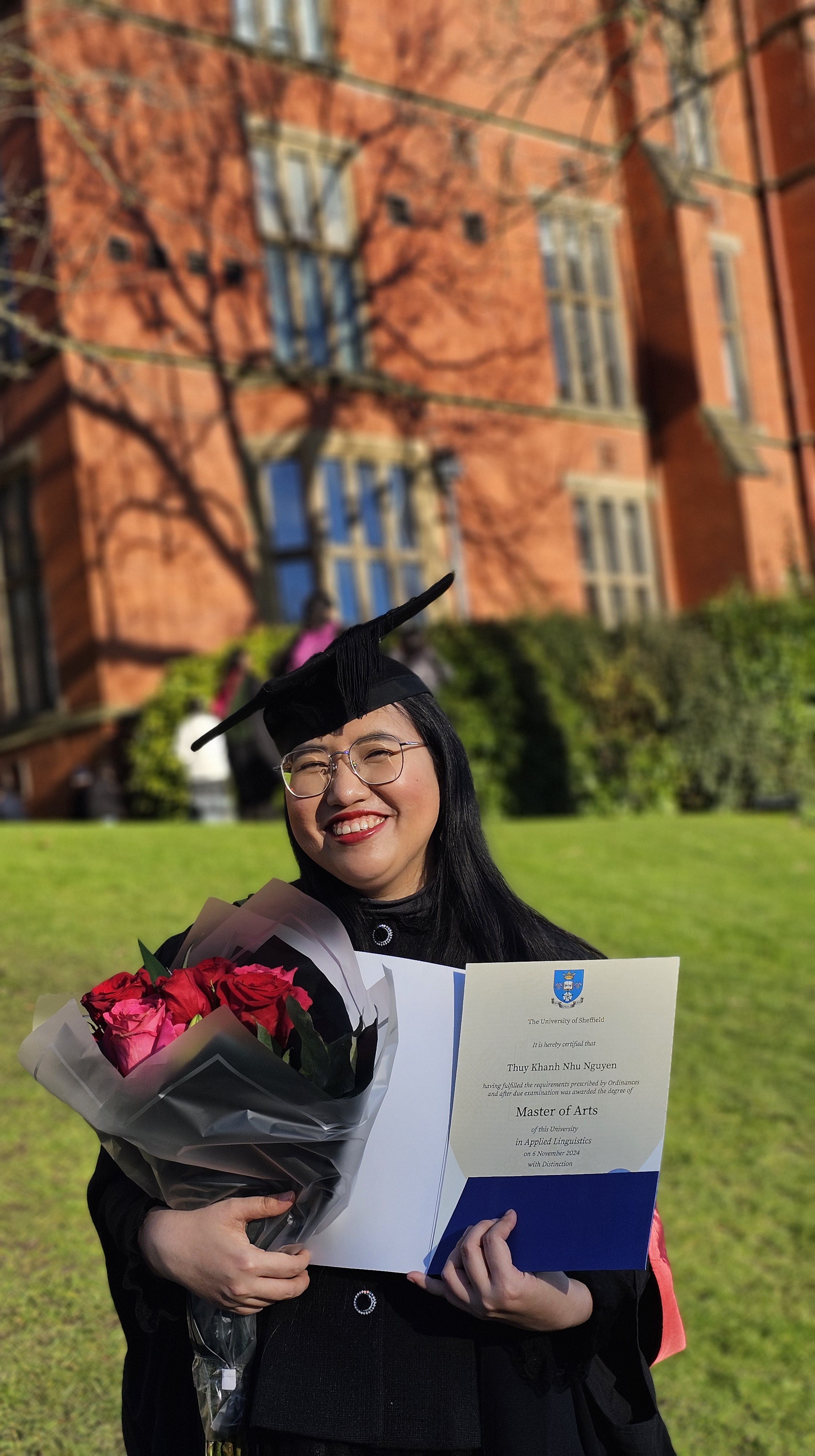 Thế nhưng chính niềm đam mê với ngôn ngữ và sự kiên trì đã giúp mình tốt nghiệp với thành tích loại Xuất sắc (Distinction), xếp thứ hai toàn khóa. Thành tích này không chỉ phản ánh năng lực tiếng Anh mà còn cho thấy khả năng nghiên cứu độc lập, tư duy phản biện và kỹ năng viết học thuật mà mình đã không ngừng rèn luyện.